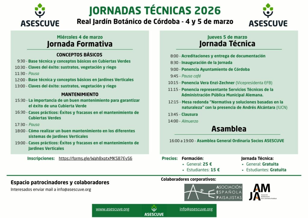 Real Jardín Botánico de Córdoba. 4 y 5 de marzo de 2026. ASESCUVE, la asociación nacional para la promoción, difusión y asesoramiento de las cubiertas verdes y los ajardinamientos verticales, organiza esta Jornada en Córdoba, con laLEER MÁS