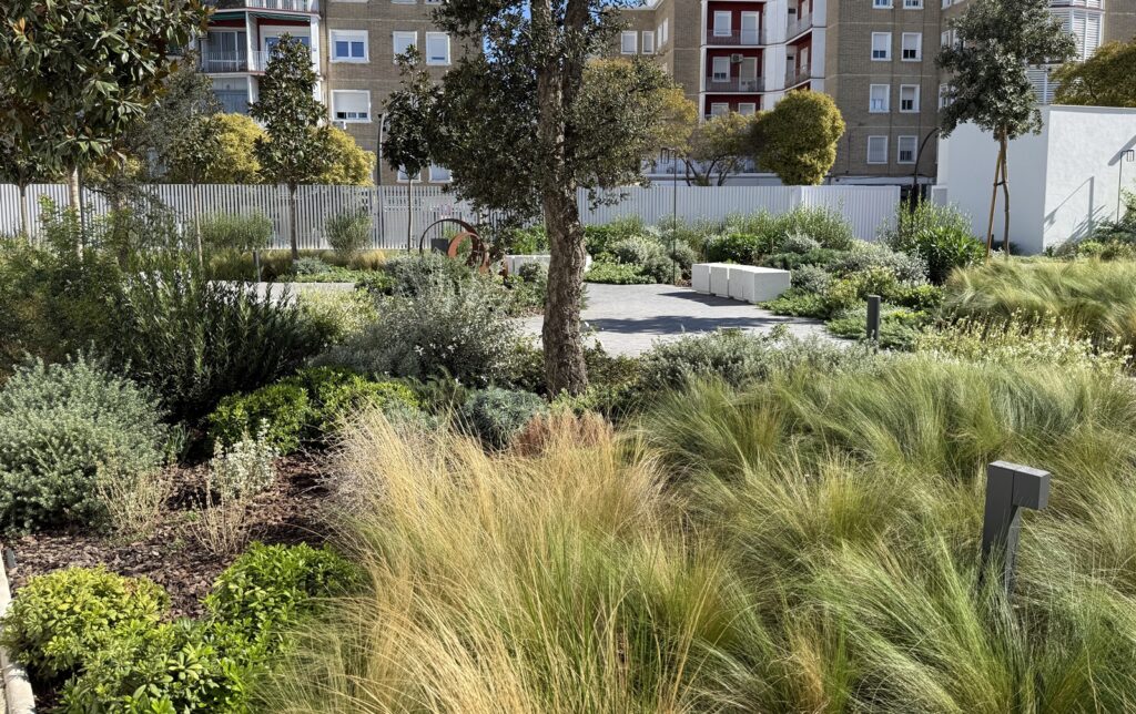 - Aun tratándose de un espacio privado, al ser una zona verde común para todos los propietarios de las viviendas recién estrenadas, nos encontramos con un excelente ejemplo de dignificación y singularidad en el enfoque y resultado de este tipo de zonas que no sólo mejoran la habitabilidad y potencialidad salutífera del espacio urbano, sino que, más prosaicamente, incluso incrementan el valor de las propiedades y la autoestima de sus habitantes.